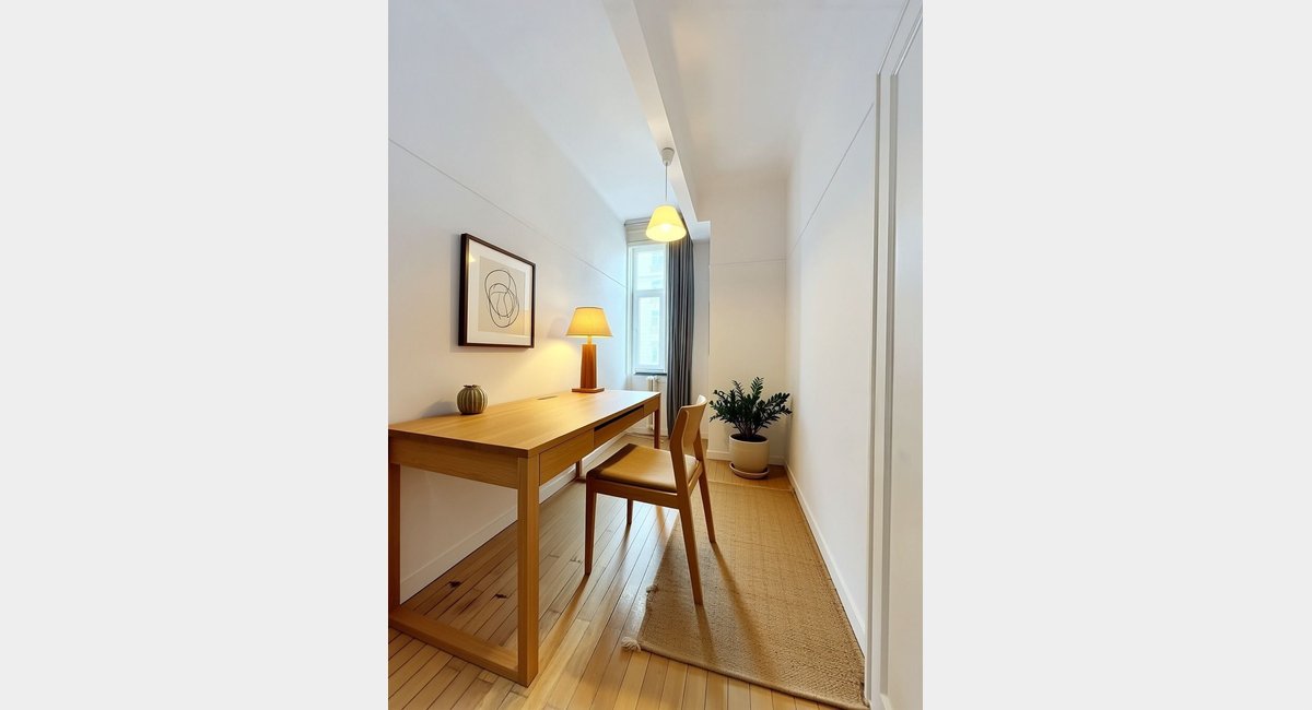 To the other side, hallway and then half-closed highly-equipped kitchen, guest WC, a small bedroom/office, a bedroom of 20 and one of 14m2. The master bedroom has its ensuite bathroom featuring a sink, shower, WC and bathtub. Separate shower room accessible via the night hall. A private basement and a maiden’s room on the last floor with incredible view on Square Montgomery are also part of this ensemble. Elevator. Plans on demand. EPC: E.