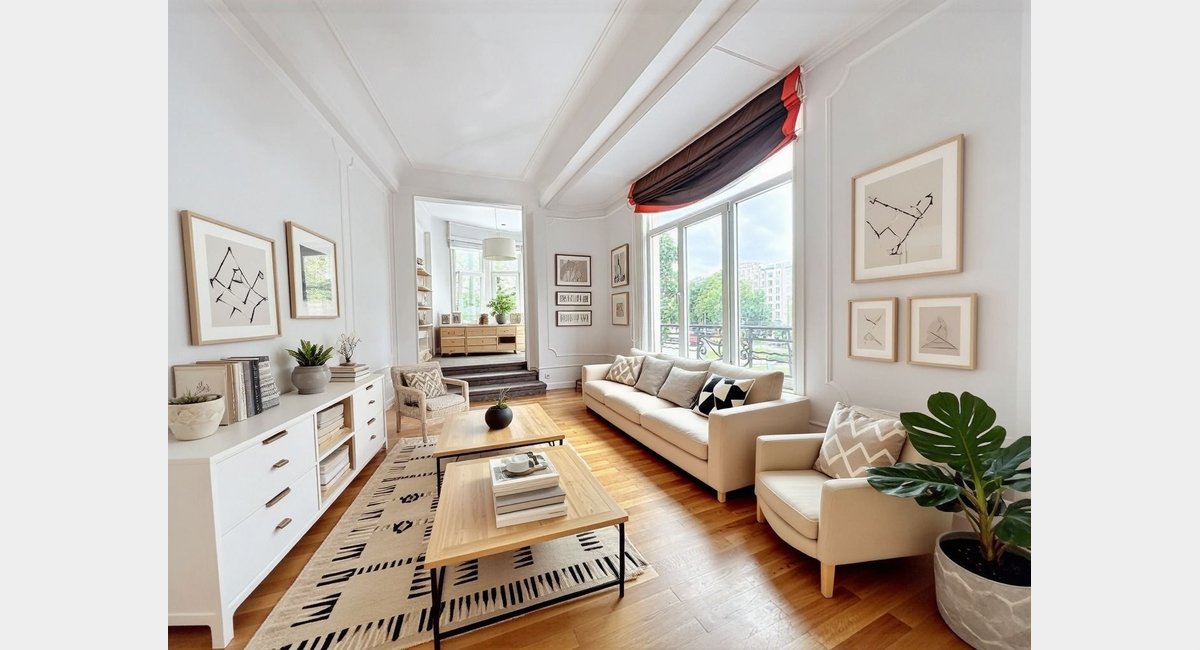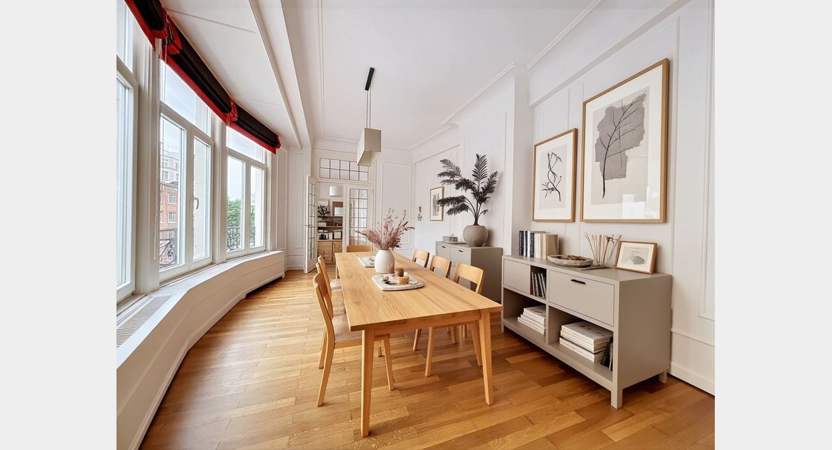 WHAT: Magnificent apartment of 154m2 located on the 2nd floor of an Art Déco building from 1992 designed in the Beaux-Arts style by architect Raymond Burgraeve. Generous entrance hall leading you to the three-part reception area consisting of dining room, living room and then – some steps up – a rotunda with a great many windows allowing for a marvellous view on Square Montgomery and its fountain.