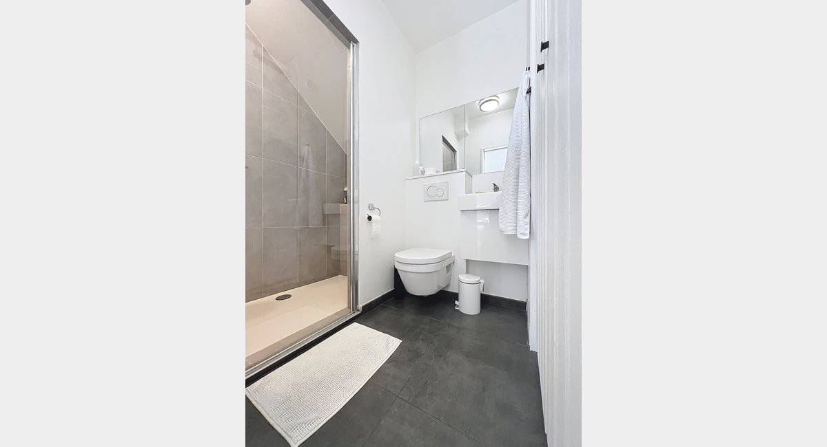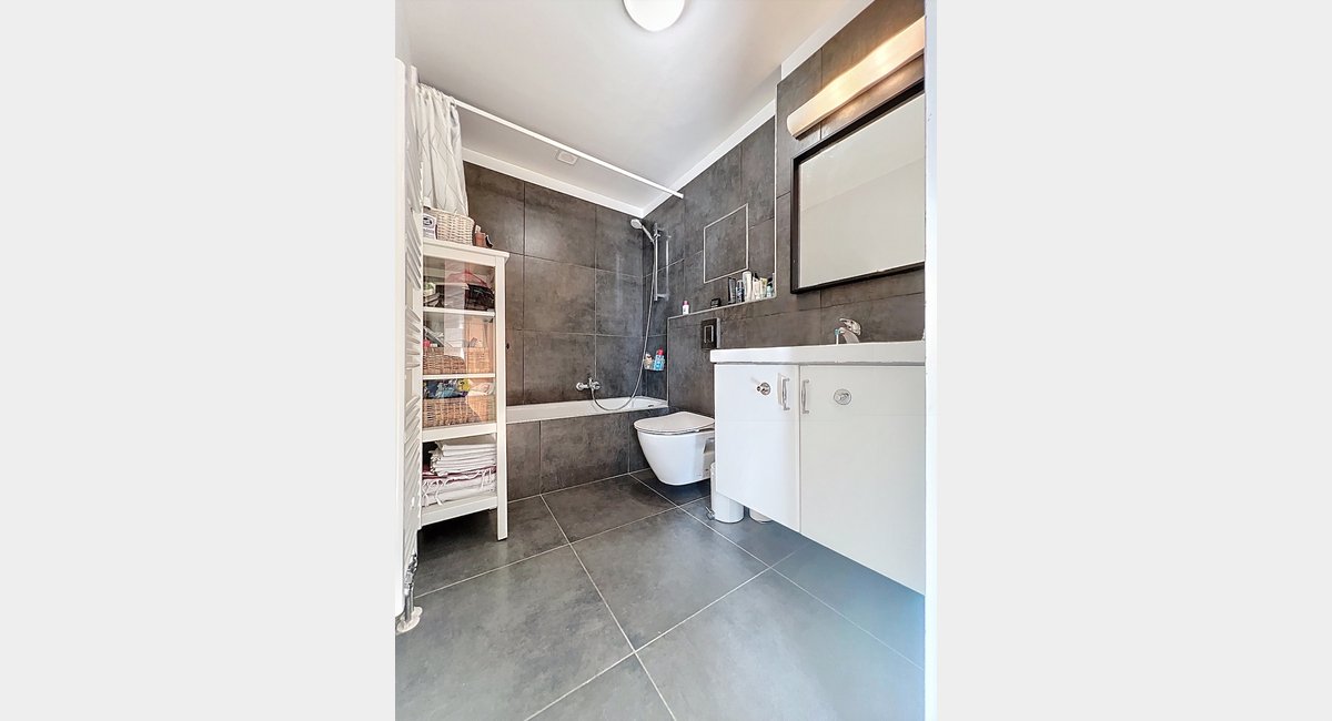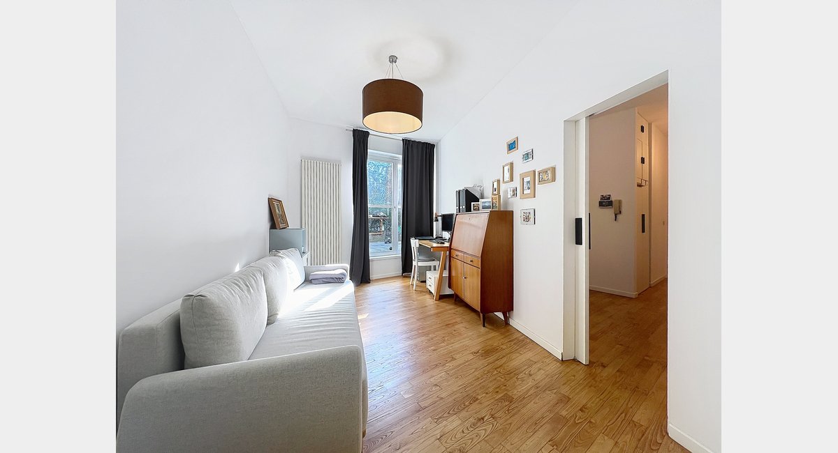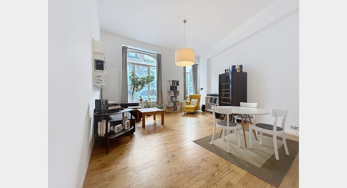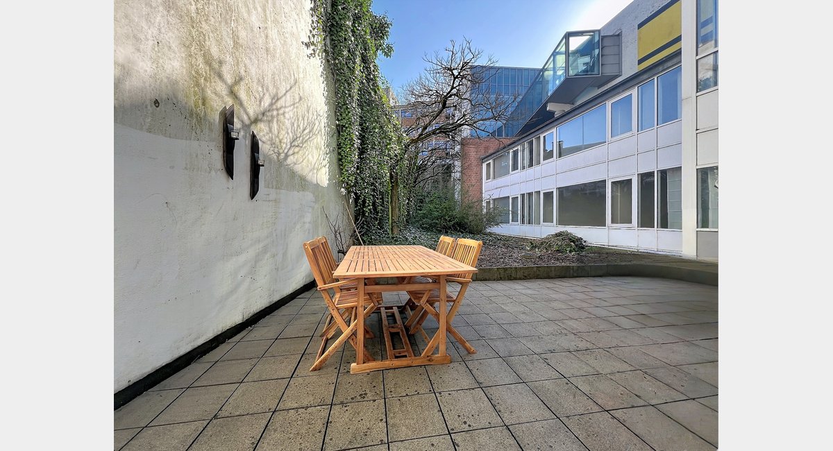 WHAT: You will love this apartment for its house feeling ! Apartment of 113m2 (surface EPC) distributed over the ground floor and 1st floor featuring a generous +-26m2 terrace towards the back. Hall way with inbuilt wardrobe leading you on to the perfectly equipped kitchen with breakfast/ bar. Next to it the office or guest room of 12m2 with its shower room and WC. Both kitchen and office go on to the huge private terrace/courtyard inviting you to host numerous receptions and dinners at your place. A set of stairs leads you a half floor up to the vast living and dining room boasting a beautifully high ceiling of 3,78m. Another set of stairs and you arrive in the cosy bedroom of 17m2, again oriented towards the back of the building and next to it the bathroom with bathtub/shower, WC and sink. Private cellar on the lower ground floor and parking spot for rent in the building. EPC: D.