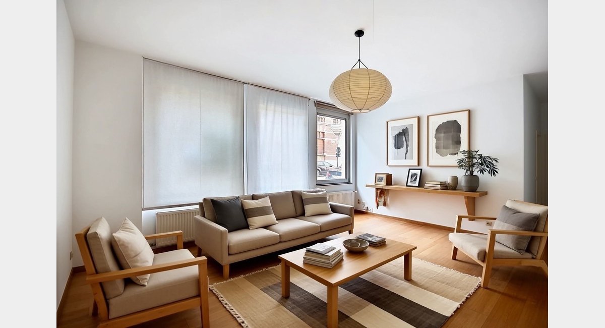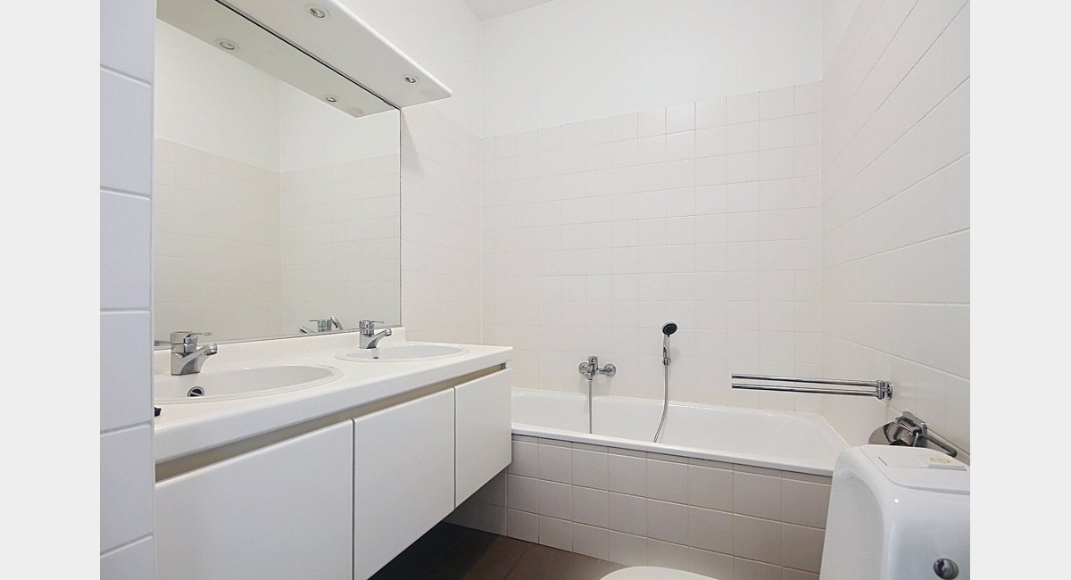 WHAT: Comfortable apartment of 87m2 in excellent condition on the ground floor of a very well kept apartment building devised by famous Belgian architect Marc Corbiau. It consists of a generous living/ dining room, a well-equipped separate kitchen, entrance hall with guest toilet and two bedrooms (15 + 9m2), each with their own bathroom/ shower room. A great many inbuilt cupboards, a separate laundry room, a concierge living on-site and a private cellar room add up to its comfort of living. A parking in the building can be bought at a supplement. Common charges at 250€/month. EPC: C.