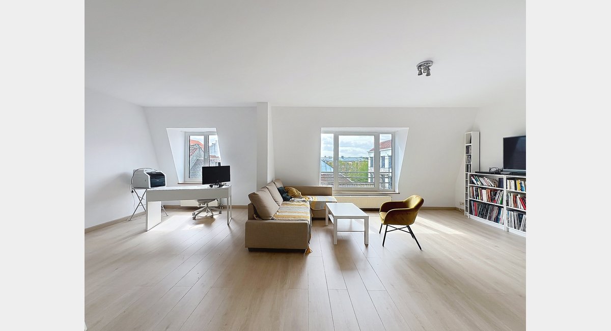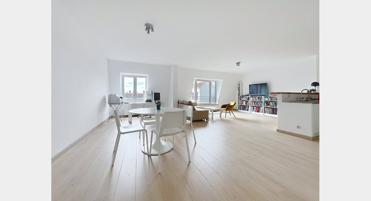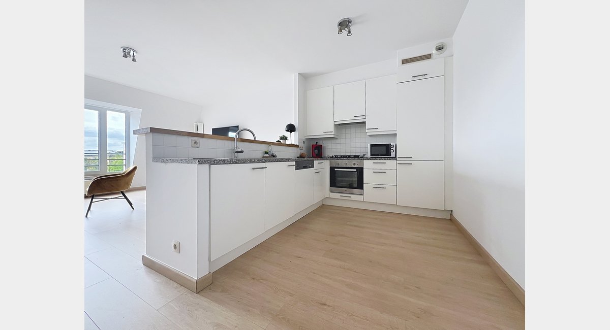 QUOI : Très lumineux moderne penthouse de 105m2 situé au 4ième et dernière étage d’un immeuble d’appartements très soigné et récent. Hall d’entrée et puis ample living/ salle à manger plein sud de 62m2 avec sa cuisine américaine hyper équipée. De l’autre côté, 2 chambres (13 + 11m2) dont une avec son dressing intégré, salle de bains avec douche/baignoire combiné et double évier et salle de douche. Buanderie séparée. L’appartement vient avec une cave privée. Emplacement de parking contre supplément.